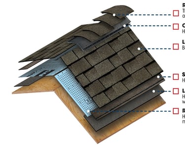El nuevo tejado consta de una nueva capa base sintética que cubre toda la superficie. A continuación, se coloca la tira de inicio, que rodea todo el perímetro del tejado. El siguiente paso es instalar todas las tejas de la casa y, finalmente, la cumbrera.